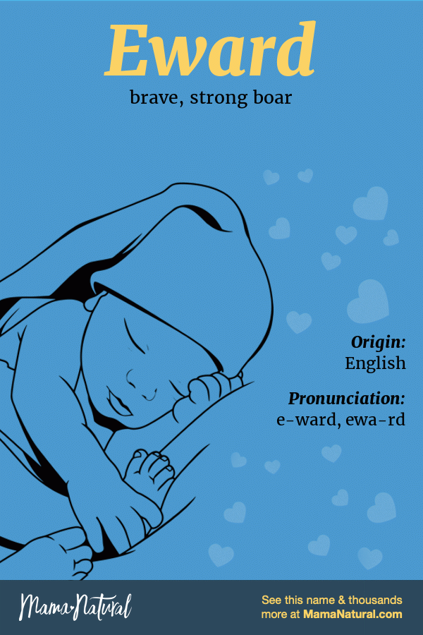 Boy Eward Eward means: brave, strong boar. Eward Name Origin: English Pronunciation: e-ward, ewa-rd Share your thoughts about Eward Share Popularity Alternatives Infographic of Eward name meaning, which is brave, strong boar Ask your friends & family about Eward… Share Pin Tweet Email Text Eward Name Popularity How popular is the name Eward? Here’s everything we know. Sorry, popularity data for the name Eward is not available. Names Like Eward If you like Eward, you’ll love these other names like Eward. What names sound like Eward? If you like how Eward sounds, you might also like these names that sound like Eward. Name Meaning Origin Popularity Other Gender Ewart Wealthy guard; brave, strong boar; shepherd English Ewert Shepherd English Ward Watchman English What names are similar to Eward? Find a name that’s like Eward, but just a little bit different. Name Meaning Origin Popularity Other Gender Edward Wealthy guard English Ewald Law-powerful English Share your thoughts on the name Eward Cancel ReplyYour email address will not be published. All fields are required *Name * Email * Your Thoughts * Δ Search Baby Names Quick Search Search Go Advanced Search Name Starts With Ends With Gender Any Boys Girls Only show unisex names Current Popularity [U.S.] Any More Popular Less Popular Origin Select origin… English Latin Hebrew Greek German Irish French American Spanish Arabic Aboriginal African American Ancient Anglo-Saxon Arabic Aramaic Armenian Arthurian Legend Asian Aztec (Nahuatl) Bulgarian Celtic Chinese Danish Dutch Egyptian English European French Gaelic German Greek Hebrew Hungarian Indian (Sanskrit) Indonesian Irish Israeli Italian Japanese Latin Modern Native American Persian Polish Polynesian Portuguese Russian Scandinavian Scottish Slavic Spanish Turkish Unknown Vietnamese Welsh Yiddish Meaning Number of Letters Min Max Syllables [BETA] Min Max Search Baby Names