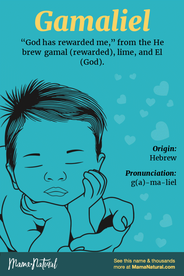 Infographic of Gamaliel name meaning, which is “God has rewarded me,” from the He brew gamal (rewarded), lime, and El (God).