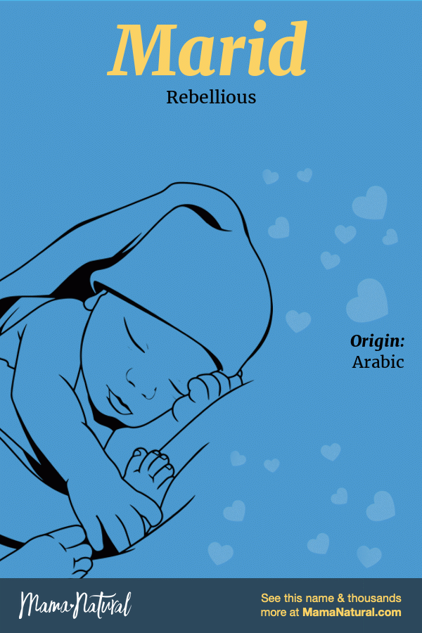 Boy Marid Marid means: Rebellious. Marid Name Origin: Arabic Share your thoughts about Marid Share Popularity Infographic of Marid name meaning, which is Rebellious Ask your friends & family about Marid… Share Pin Tweet Email Text Marid Name Popularity How popular is the name Marid? Here’s everything we know. Sorry, popularity data for the name Marid is not available. Share your thoughts on the name Marid Cancel ReplyYour email address will not be published. All fields are required *Name * Email * Your Thoughts * Δ Search Baby Names Quick Search Search Go Advanced Search Name Starts With Ends With Gender Any Boys Girls Only show unisex names Current Popularity [U.S.] Any More Popular Less Popular Origin Select origin… English Latin Hebrew Greek German Irish French American Spanish Arabic Aboriginal African American Ancient Anglo-Saxon Arabic Aramaic Armenian Arthurian Legend Asian Aztec (Nahuatl) Bulgarian Celtic Chinese Danish Dutch Egyptian English European French Gaelic German Greek Hebrew Hungarian Indian (Sanskrit) Indonesian Irish Israeli Italian Japanese Latin Modern Native American Persian Polish Polynesian Portuguese Russian Scandinavian Scottish Slavic Spanish Turkish Unknown Vietnamese Welsh Yiddish Meaning Number of Letters Min Max Syllables [BETA] Min Max Search Baby Names
