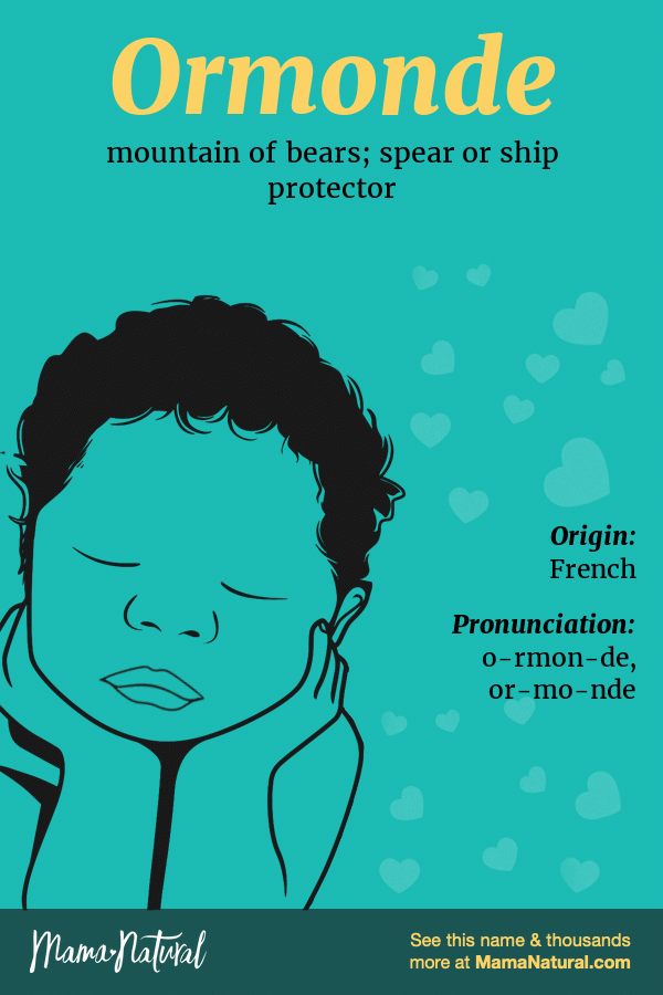 Boy Girl’s name Ormonde Ormonde Ormonde means: mountain of bears; spear or ship protector. Ormonde Name Origin: French Pronunciation: o-rmon-de, or-mo-nde Share your thoughts about Ormonde Share Popularity Alternatives Infographic of Ormonde name meaning, which is mountain of bears; spear or ship protector Ask your friends & family about Ormonde… Share Pin Tweet Email Text Ormonde Name Popularity How popular is the name Ormonde? Here’s everything we know. Sorry, popularity data for the name Ormonde is not available. Names Like Ormonde If you like Ormonde, you’ll love these other names like Ormonde. What names sound like Ormonde? If you like how Ormonde sounds, you might also like these names that sound like Ormonde. Name Meaning Origin Popularity Other Gender Armonde French Ormondo French What names are similar to Ormonde? Find a name that’s like Ormonde, but just a little bit different. Name Meaning Origin Popularity Other Gender Armande French Armond French Armondo French Orlondo Spanish Ormand Sea man; spear man; mountain of bears; spear or ship protector German Osmond God's protection Scandinavian Osmonde God's protection Scandinavian Osmunde God's protection Scandinavian Ramonde Protecting hands German Share your thoughts on the name Ormonde Cancel ReplyYour email address will not be published. All fields are required *Name * Email * Your Thoughts * Δ Search Baby Names Quick Search Search Go Advanced Search Name Starts With Ends With Gender Any Boys Girls Only show unisex names Current Popularity [U.S.] Any More Popular Less Popular Origin Select origin… English Latin Hebrew Greek German Irish French American Spanish Arabic Aboriginal African American Ancient Anglo-Saxon Arabic Aramaic Armenian Arthurian Legend Asian Aztec (Nahuatl) Bulgarian Celtic Chinese Danish Dutch Egyptian English European French Gaelic German Greek Hebrew Hungarian Indian (Sanskrit) Indonesian Irish Israeli Italian Japanese Latin Modern Native American Persian Polish Polynesian Portuguese Russian Scandinavian Scottish Slavic Spanish Turkish Unknown Vietnamese Welsh Yiddish Meaning Number of Letters Min Max Syllables [BETA] Min Max Search Baby Names