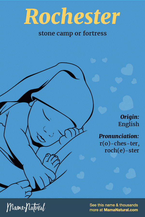 Boy Rochester Rochester means: stone camp or fortress. Rochester Name Origin: English Pronunciation: r(o)-ches-ter, roch(e)-ster Share your thoughts about Rochester Share Popularity Alternatives Lists Infographic of Rochester name meaning, which is stone camp or fortress Ask your friends & family about Rochester… Share Pin Tweet Email Text Rochester Name Popularity How popular is the name Rochester? Here’s everything we know. Chart Raw Data By State Year Rank # Births % Births 1910 — 0 0% 1911 — 0 0% 1912 — 0 0% 1913 — 0 0% 1914 — 0 0% 1915 — 0 0% 1916 — 0 0% 1917 — 0 0% 1918 — 0 0% 1919 — 0 0% 1920 — 0 0% 1921 — 0 0% 1922 — 0 0% 1923 — 0 0% 1924 — 0 0% 1925 — 0 0% 1926 — 0 0% 1927 — 0 0% 1928 — 0 0% 1929 — 0 0% 1930 — 0 0% 1931 — 0 0% 1932 — 0 0% 1933 — 0 0% 1934 — 0 0% 1935 — 0 0% 1936 — 0 0% 1937 — 0 0% 1938 — 0 0% 1939 — 0 0% 1940 — 0 0% 1941 — 0 0% 1942 — 0 0% 1943 1,325 6 0.0005% 1944 — 0 0% 1945 — 0 0% 1946 — 0 0% 1947 — 0 0% 1948 — 0 0% 1949 1,449 5 0.0003% 1950 — 0 0% 1951 — 0 0% 1952 — 0 0% 1953 — 0 0% 1954 — 0 0% 1955 — 0 0% 1956 — 0 0% 1957 1,287 10 0.0005% 1958 — 0 0% 1959 — 0 0% 1960 — 0 0% 1961 — 0 0% 1962 — 0 0% 1963 — 0 0% 1964 — 0 0% 1965 — 0 0% 1966 — 0 0% 1967 — 0 0% 1968 — 0 0% 1969 — 0 0% 1970 — 0 0% 1971 — 0 0% 1972 — 0 0% 1973 — 0 0% 1974 — 0 0% 1975 — 0 0% 1976 — 0 0% 1977 — 0 0% 1978 — 0 0% 1979 — 0 0% 1980 — 0 0% 1981 — 0 0% 1982 — 0 0% 1983 — 0 0% 1984 — 0 0% 1985 — 0 0% 1986 — 0 0% 1987 — 0 0% 1988 — 0 0% 1989 — 0 0% 1990 — 0 0% 1991 — 0 0% 1992 — 0 0% 1993 — 0 0% 1994 — 0 0% 1995 — 0 0% 1996 — 0 0% 1997 — 0 0% 1998 — 0 0% 1999 — 0 0% 2000 — 0 0% 2001 — 0 0% 2002 — 0 0% 2003 — 0 0% 2004 — 0 0% 2005 — 0 0% 2006 — 0 0% 2007 — 0 0% 2008 — 0 0% 2009 — 0 0% 2010 — 0 0% 2011 — 0 0% 2012 — 0 0% 2013 — 0 0% 2014 — 0 0% 2015 — 0 0% 2016 — 0 0% 2017 — 0 0% 2018 — 0 0% 2019 — 0 0% 2020 — 0 0% 2021 — 0 0% 2022 — 0 0% 2023 — 0 0% Alabama (AL) Georgia (GA) Mississippi (MS) Data via SSA.gov. Names Like Rochester If you like Rochester, you’ll love these other names like Rochester. What names are variants of Rochester? Mix it up with these names that are a variation of the name Rochester. Name Meaning Origin Popularity Other Gender Chester Camp of soldiers Latin Chet Camp of soldiers; stone camp or fortress Latin Rock Stone English Lists With Rochester Find inspiration in these baby boy name lists featuring the name Rochester. Long Boy Names With Power and Presence // 177 names Long boy names have a built-in seriousness you can’t help but love, plus heaps of nickname potential. Discover these letter-rich finds with us. City Names for Boys With Urban Appeal // 104 names Show your love for big city lights and action with city names for boys. Browse our list and see which urban oasis might rock your name list. Yee Haw! Cowboy Names for Boys // 147 names Packed with energy, cowboy names for boys make amazing monikers. From words names to real cowboys, we’ve herded them up into one rowdy list. Share your thoughts on the name Rochester Cancel ReplyYour email address will not be published. All fields are required *Name * Email * Your Thoughts * Δ Search Baby Names Quick Search Search Go Advanced Search Name Starts With Ends With Gender Any Boys Girls Only show unisex names Current Popularity [U.S.] Any More Popular Less Popular Origin Select origin… English Latin Hebrew Greek German Irish French American Spanish Arabic Aboriginal African American Ancient Anglo-Saxon Arabic Aramaic Armenian Arthurian Legend Asian Aztec (Nahuatl) Bulgarian Celtic Chinese Danish Dutch Egyptian English European French Gaelic German Greek Hebrew Hungarian Indian (Sanskrit) Indonesian Irish Israeli Italian Japanese Latin Modern Native American Persian Polish Polynesian Portuguese Russian Scandinavian Scottish Slavic Spanish Turkish Unknown Vietnamese Welsh Yiddish Meaning Number of Letters Min Max Syllables [BETA] Min Max Search Baby Names