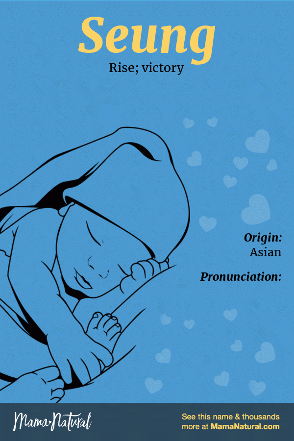Boy Seung Seung means: Rise; victory. Seung Name Origin: Asian Pronunciation: Share your thoughts about Seung Share Popularity Lists Infographic of Seung name meaning, which is Rise; victory Ask your friends & family about Seung… Share Pin Tweet Email Text Seung Name Popularity How popular is the name Seung? Here’s everything we know. Sorry, popularity data for the name Seung is not available. Lists With Seung Find inspiration in these baby boy name lists featuring the name Seung. Korean Boy Names for Your Littlest Lovebug // 98 names Korean boy names offer a window into an incredible land of rolling greenery, cherry forests, and ancient temples. Get to know them with us. Share your thoughts on the name Seung Cancel ReplyYour email address will not be published. All fields are required *Name * Email * Your Thoughts * Δ Search Baby Names Quick Search Search Go Advanced Search Name Starts With Ends With Gender Any Boys Girls Only show unisex names Current Popularity [U.S.] Any More Popular Less Popular Origin Select origin… English Latin Hebrew Greek German Irish French American Spanish Arabic Aboriginal African American Ancient Anglo-Saxon Arabic Aramaic Armenian Arthurian Legend Asian Aztec (Nahuatl) Bulgarian Celtic Chinese Danish Dutch Egyptian English European French Gaelic German Greek Hebrew Hungarian Indian (Sanskrit) Indonesian Irish Israeli Italian Japanese Latin Modern Native American Persian Polish Polynesian Portuguese Russian Scandinavian Scottish Slavic Spanish Turkish Unknown Vietnamese Welsh Yiddish Meaning Number of Letters Min Max Syllables [BETA] Min Max Search Baby Names