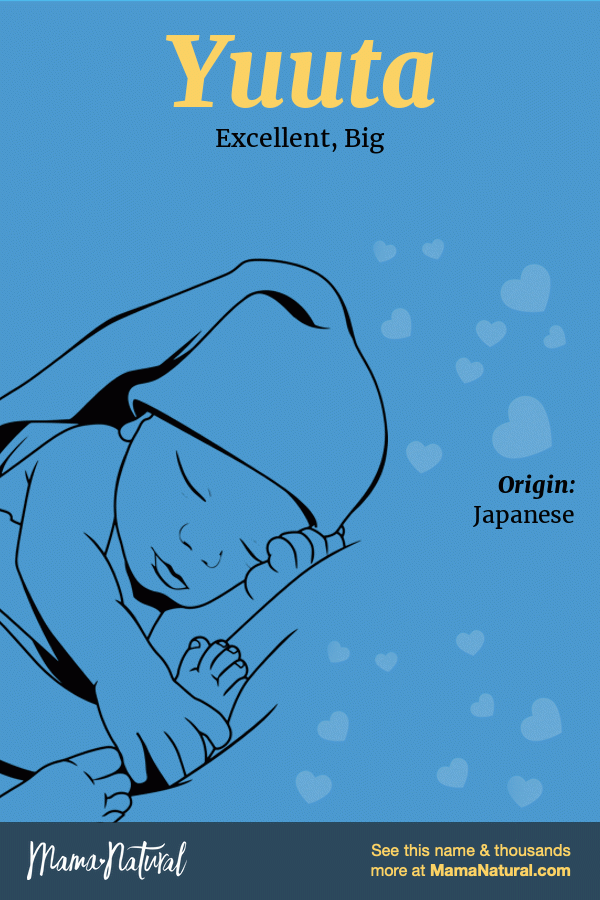 Boy Yuuta Yuuta means: Excellent, Big. Yuuta Name Origin: Japanese Share your thoughts about Yuuta Share Popularity Infographic of Yuuta name meaning, which is Excellent, Big Ask your friends & family about Yuuta… Share Pin Tweet Email Text Yuuta Name Popularity How popular is the name Yuuta? Here’s everything we know. Sorry, popularity data for the name Yuuta is not available. Share your thoughts on the name Yuuta Cancel ReplyYour email address will not be published. All fields are required *Name * Email * Your Thoughts * Δ Search Baby Names Quick Search Search Go Advanced Search Name Starts With Ends With Gender Any Boys Girls Only show unisex names Current Popularity [U.S.] Any More Popular Less Popular Origin Select origin… English Latin Hebrew Greek German Irish French American Spanish Arabic Aboriginal African American Ancient Anglo-Saxon Arabic Aramaic Armenian Arthurian Legend Asian Aztec (Nahuatl) Bulgarian Celtic Chinese Danish Dutch Egyptian English European French Gaelic German Greek Hebrew Hungarian Indian (Sanskrit) Indonesian Irish Israeli Italian Japanese Latin Modern Native American Persian Polish Polynesian Portuguese Russian Scandinavian Scottish Slavic Spanish Turkish Unknown Vietnamese Welsh Yiddish Meaning Number of Letters Min Max Syllables [BETA] Min Max Search Baby Names