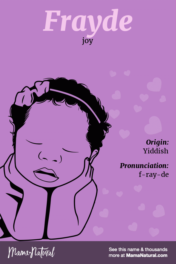 Girl Frayde Frayde means: joy. Frayde Name Origin: Yiddish Pronunciation: f-ray-de Share your thoughts about Frayde Share Popularity Alternatives Infographic of Frayde name meaning, which is joy Ask your friends & family about Frayde… Share Pin Tweet Email Text Frayde Name Popularity How popular is the name Frayde? Here’s everything we know. Sorry, popularity data for the name Frayde is not available. Names Like Frayde If you like Frayde, you’ll love these other names like Frayde. What names sound like Frayde? If you like how Frayde sounds, you might also like these names that sound like Frayde. Name Meaning Origin Popularity Other Gender Freyda Joy Yiddish Freyde Joy Yiddish Fryda Elf or magical counsel; elf, magical being strength German What names are similar to Frayde? Find a name that’s like Frayde, but just a little bit different. Name Meaning Origin Popularity Other Gender Fayda Plentiful Arabic Franie From France Latin Fraya Noble lady Scandinavian Fraydel Joy Yiddish Freydel Joy Yiddish Share your thoughts on the name Frayde Cancel ReplyYour email address will not be published. All fields are required *Name * Email * Your Thoughts * Δ Search Baby Names Quick Search Search Go Advanced Search Name Starts With Ends With Gender Any Boys Girls Only show unisex names Current Popularity [U.S.] Any More Popular Less Popular Origin Select origin… English Latin Hebrew Greek German Irish French American Spanish Arabic Aboriginal African American Ancient Anglo-Saxon Arabic Aramaic Armenian Arthurian Legend Asian Aztec (Nahuatl) Bulgarian Celtic Chinese Danish Dutch Egyptian English European French Gaelic German Greek Hebrew Hungarian Indian (Sanskrit) Indonesian Irish Israeli Italian Japanese Latin Modern Native American Persian Polish Polynesian Portuguese Russian Scandinavian Scottish Slavic Spanish Turkish Unknown Vietnamese Welsh Yiddish Meaning Number of Letters Min Max Syllables [BETA] Min Max Search Baby Names